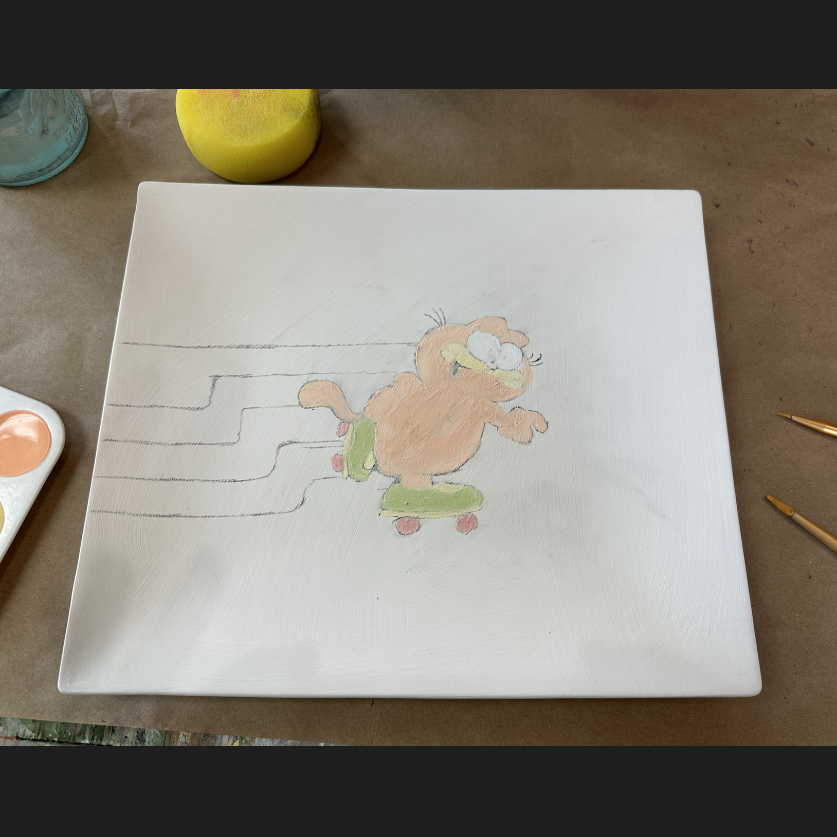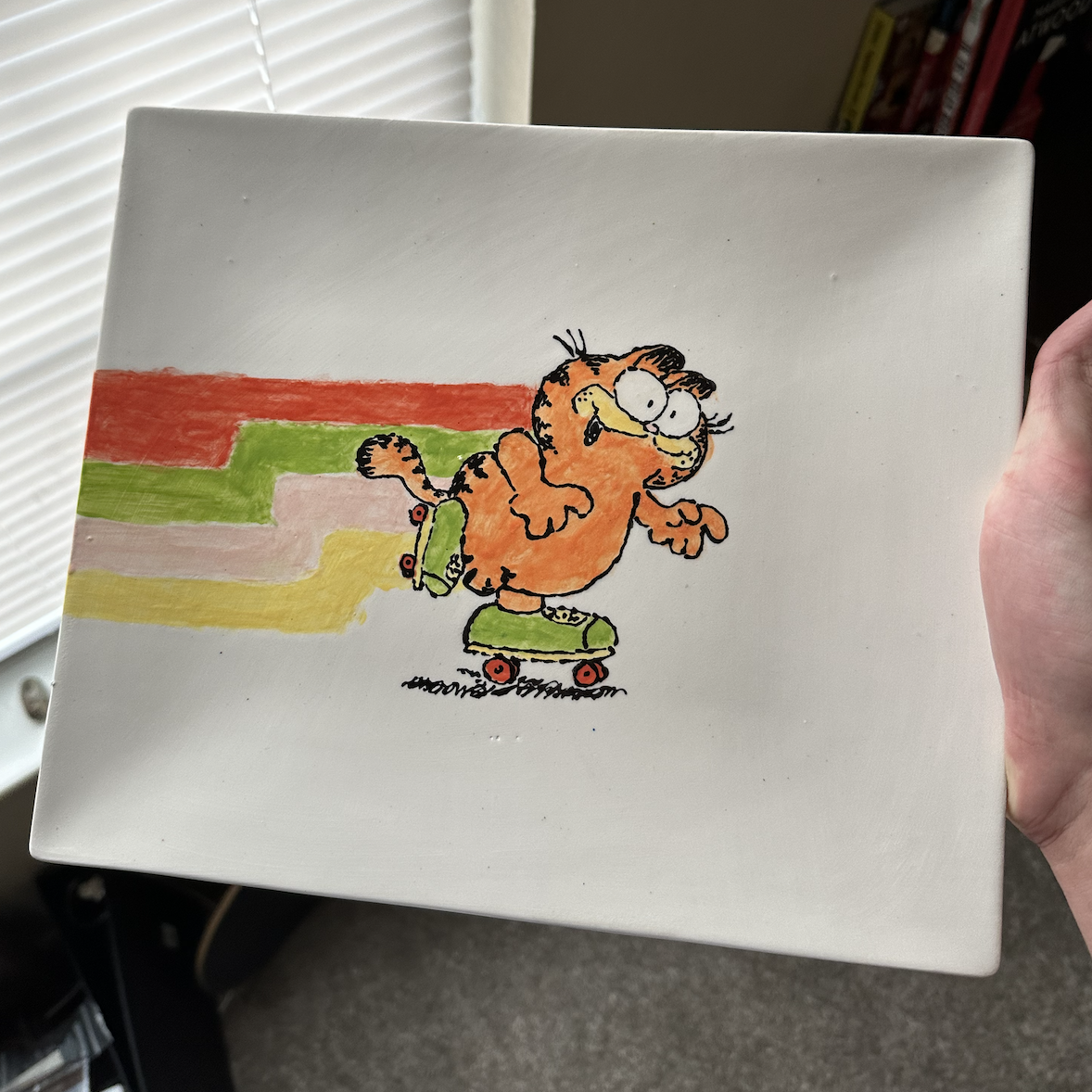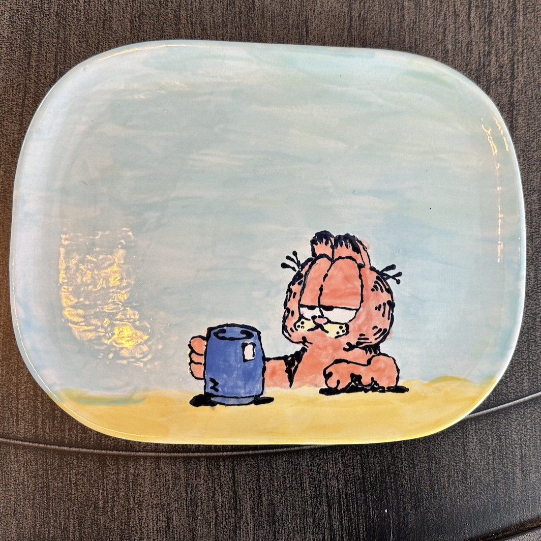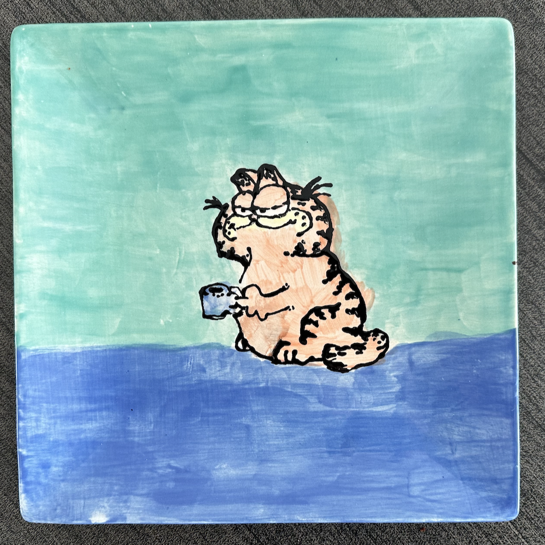 I am somewhat obsessed with Jim Davis’ Garfield. Particularly making pieces of pottery at paint-your-own-pottery shops around Ohio. I like keeping each piece as accurate as possible to the original comics.
